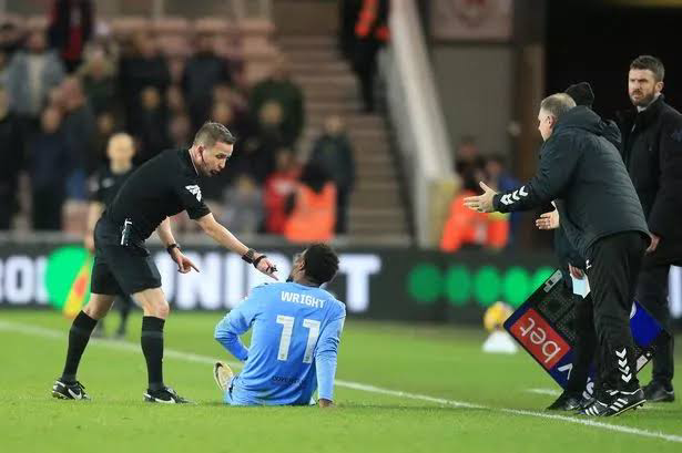 At about the 80-minute mark on New Year’s Day, he went to the deck near the dugouts and seemed to be having groin pain. He ultimately hobbled off the field with his left short leg pulled up. To make matters worse, referee David Webb, who had told Wright to leave the field so that play could resume, booked him for time wasting.