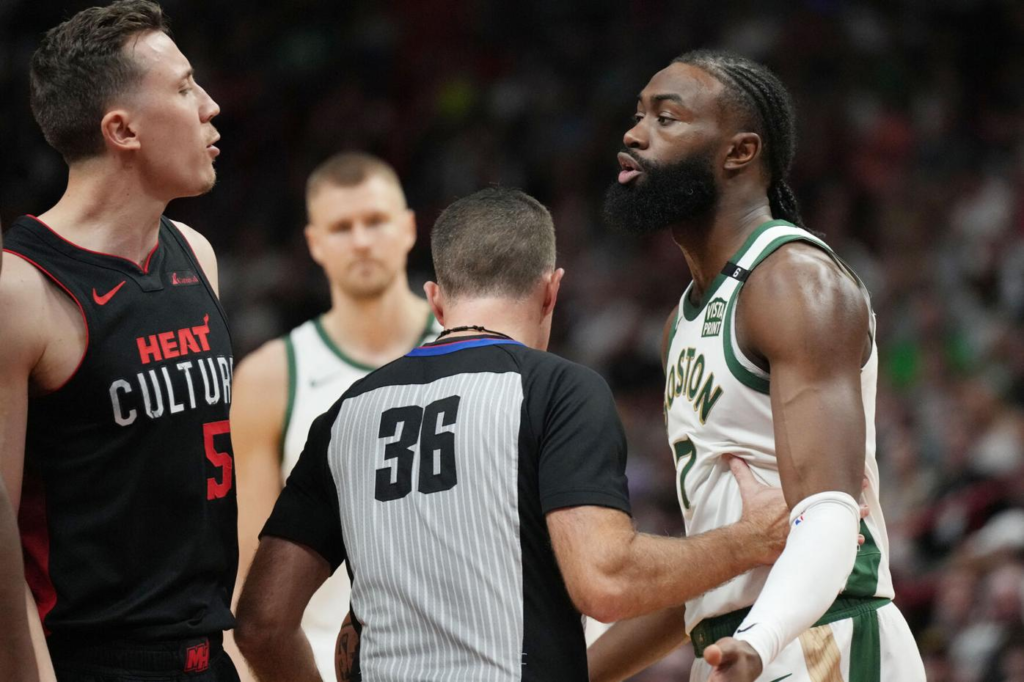 In the fourth quarter of Sunday afternoon’s hotly contested game between the Boston Celtics and the Miami Heat, Jaylen Brown and Duncan Robinson got into a furious altercation.