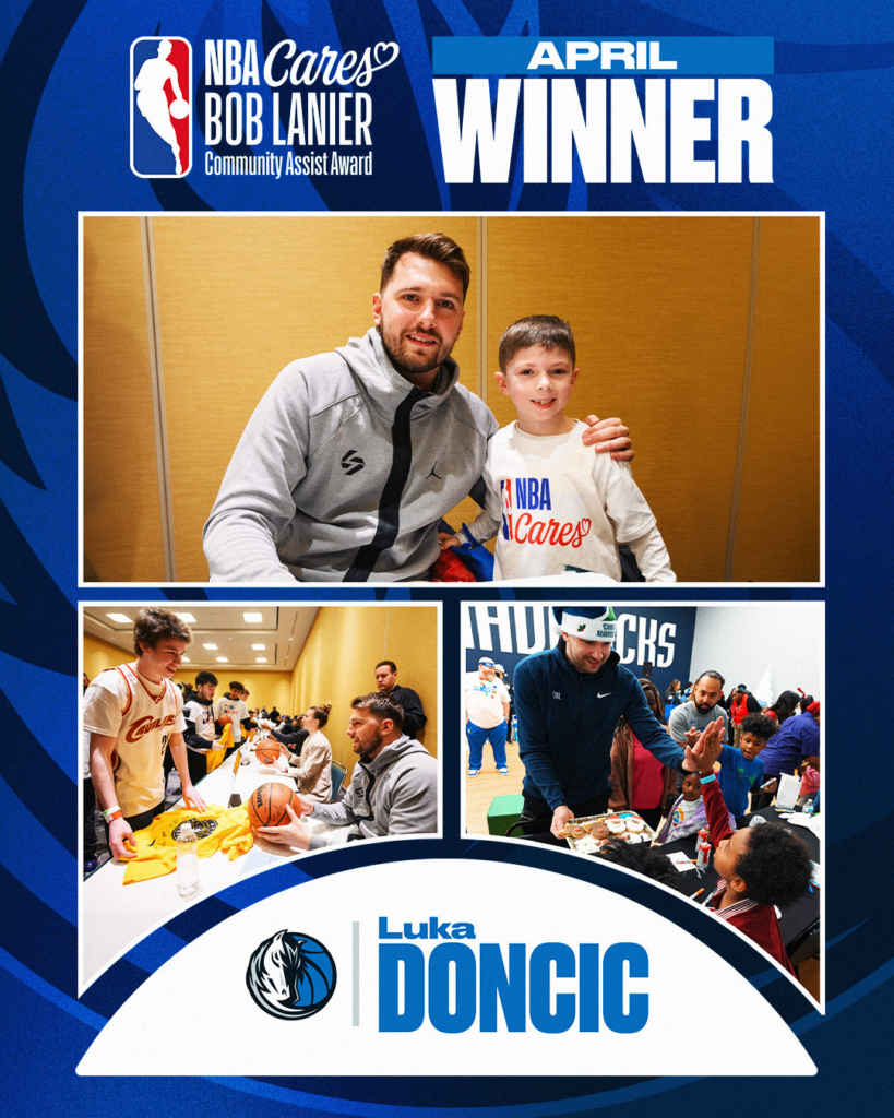 April 26, 2024 – The NBA today announced Dallas Mavericks guard Luka Dončić as the NBA Cares Bob Lanier Community Assist Award winner for the month of April. Dončić is being recognized for his efforts in providing memorable experiences for youth and uplifting communities. Dončić will receive the David Robinson trophy and the NBA will donate $10,000 to the Luka Dončić Foundation, which aims to empower local heroes who bring the magic of sports and active play to children in their communities.